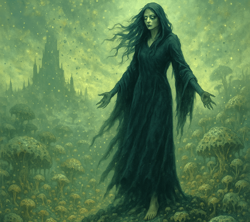 Nessuno vide da dove fosse giunta. Una donna senza tempo, avvolta in un mantello grigio che pareva intessuto di nebbia e silenzio. Camminava a piedi nudi, e ogni passo lasciava una traccia umida sul terreno, come se la terra stessa avvizzisse sotto il suo passaggio. Non portava armi, né minacciava con parole. Si limitava a respirare. E a ogni respiro, l’aria sembrava farsi più pesante. Piccoli filamenti impalpabili si sollevavano attorno a lei, danzando come pollini al tramonto. Spore invisibili, eppure voraci. Nessuno sapeva il suo nome. Ma ben presto, tutti avrebbero imparato a temerlo.