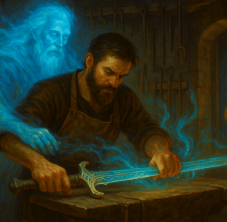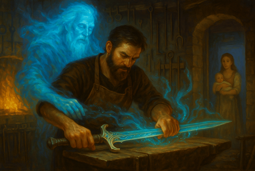 E mentre il giorno si spegneva, e il cielo si accendeva di stelle, Eiran si fermava a contemplare il suo lavoro. Il sudore gli rigava il volto, il respiro ancora affannoso. Ma negli occhi aveva quella calma che conoscono solo gli uomini in pace con il proprio dono. Sul tavolo, una spada riposava. Lunga, elegante, appena forgiata. Nel riflesso della lama, per un attimo, una seconda figura apparve dietro di lui: Auren. Un uomo anziano, dai lunghi capelli d’argento e lo sguardo pieno di malinconia e fierezza. Trasparente come nebbia. Reale come sangue. Ma solo Eiran lo vedeva. Solo Eiran lo sentiva. E per ora, bastava così.